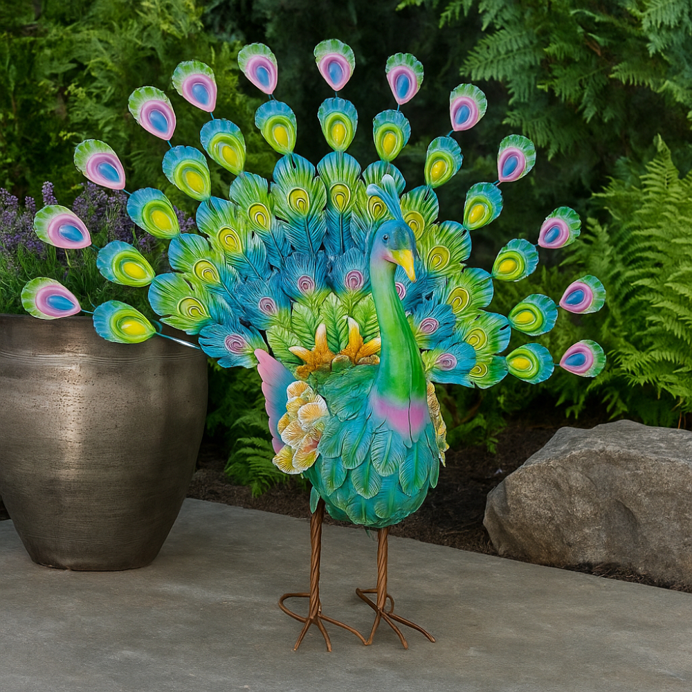 Add a vibrant touch to your garden or home with this stunning 30-inch wide metal peacock statue. Crafted from durable, weather-resistant metal, the statue features intricate detailing and bright, eye-catching colors that capture the beauty and elegance of a peacock in full display. Perfect for outdoor decor, it brings a bold, artistic flair to any space, whether placed in your garden, on a patio, or as a striking indoor accent. A unique blend of artistry and nature, this peacock statue is sure to be a conversation starter.