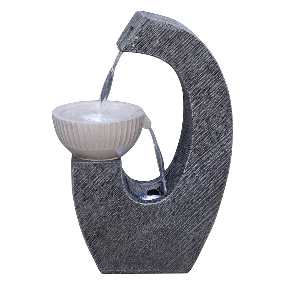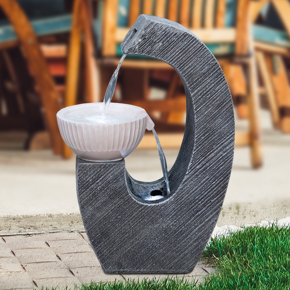 Elevate your space with the sleek sophistication of this 22-inch Biscayne fountain. Designed with clean, contemporary lines, it features water flowing gracefully into a sculpted basin for a soothing visual and auditory experience. Integrated cool white LED lighting creates a striking nighttime ambiance, highlighting the gentle cascade with a crisp, modern glow. The included energy-efficient pump ensures continuous water flow while conserving power, making it as practical as it is beautiful. Perfect for patios, and outdoor spaces, this fountain adds a refined touch of serenity wherever it’s placed. Made from Comp-Cast®, a durable stone, fibre and resin material.