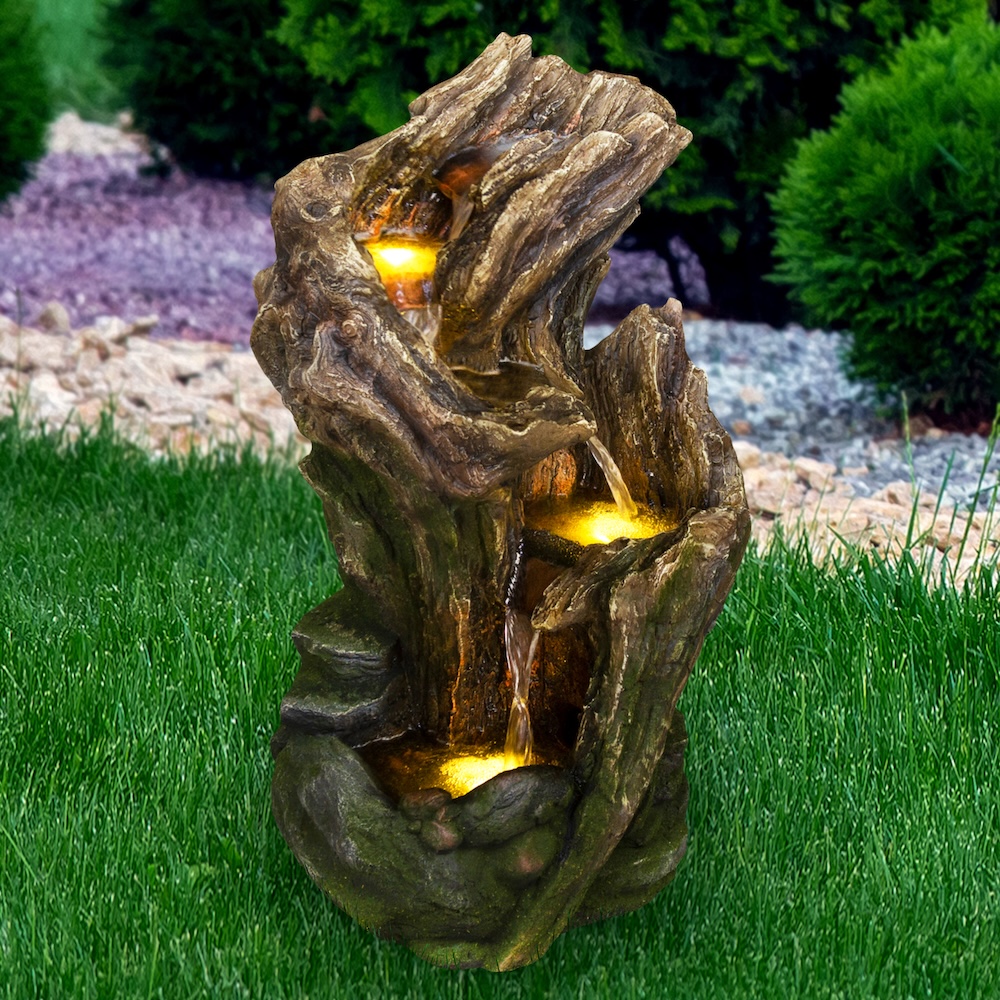 Bring the serene beauty of nature into your garden with the Whispering Woods waterfall fountain. Standing at 21.7 inches tall, this enchanting design captures the gentle flow of water cascading over wood-inspired tiers, creating a peaceful soundscape that soothes the senses. Warm, integrated LED lighting highlights the waterfall at night, casting a soft glow that enhances the fountain’s woodland charm. A built-in energy-efficient pump keeps the water flowing smoothly while conserving power, so you can enjoy the relaxing ambiance day and night. Perfect as a centerpiece or as a tranquil accent outdoors, the Whispering Woods fountain transforms any space into a calming retreat. Made from Comp-Cast®, a durable stone, fibre and resin material.